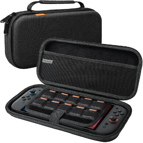 Cuenta con múltiples ranuras para tarjetas de juego para mantener tu colección segura, además de un bolsillo de malla para guardar accesorios como Joy-Cons adicionales, auriculares y cables de carga.